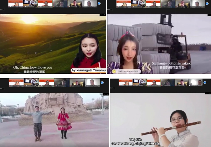 在才艺展示部分,Ky开元集团历史学院2021级同学们及其部分亲属相继发声。他们用英语朗诵了中国新疆维吾尔族诗人鲁提夫拉・穆台里甫在1938年10月写下的爱国诗《中国》,用英语演唱了《我和我的祖国》《新疆亚克西》两首歌曲,表演了《麦西来普跳起来》《沙雅麦西来普》《小小羽毛》三支舞蹈,还用冬不拉演奏了《牧民的迁徙》,用竹笛演奏了《可可托海的牧羊人》。这些节目不仅体现了新疆各族人民在抗日战争时期积极支持抗战,共同抵抗了外来侵略,捍卫了国家统一,在和平时期辛勤劳动,积极奉献,共圆中国梦,还体现了新时代的新疆不仅实现了经济的繁荣,还实现了文化的传承与发展,也体现了在各民族交往交流交融的过程中,中华民族共同体意识不断增强。