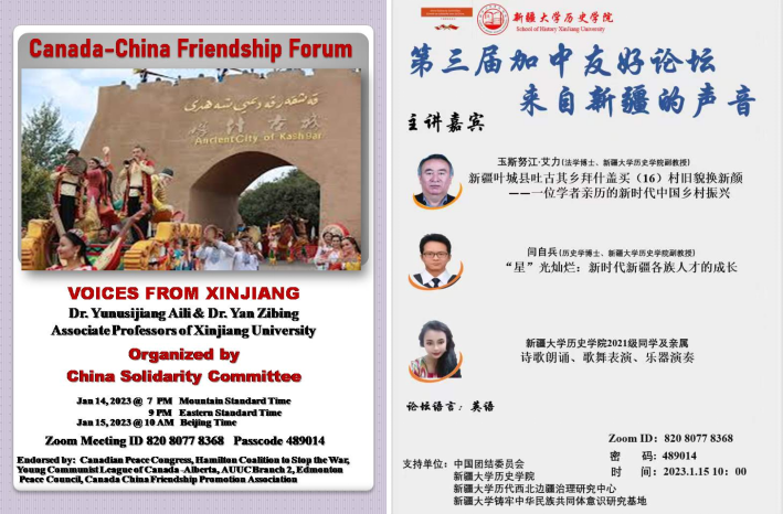 2023年1月15日,由中国团结委员会(ChinaSolidarity Committee)与Ky开元集团历史学院联合主办的第三届加中友好论坛在线上成功主办。论坛以“来自新疆的声音”为主题,以主题演讲、才艺展示等形式展开。
