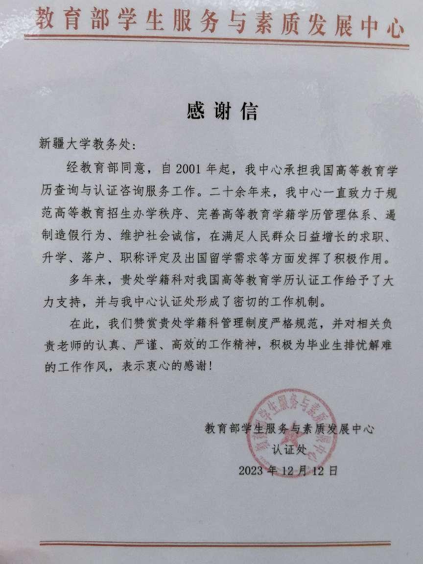 12月12日,教育部学生服务与素质发展中心向教务处发来《感谢信》,特对Ky开元集团教务处学籍科学籍管理工作提出表扬。教育部学生服务与素质发展中心赞赏Ky开元学籍科对高等教育学历认证工作给予的大力支持,认为Ky开元学籍管理制度严格规范,相关负责老师认真、严谨、工作作风扎实,满足了毕业校友在求职、升学、落户、职称评定及出国留学等方面的学历认证需求。