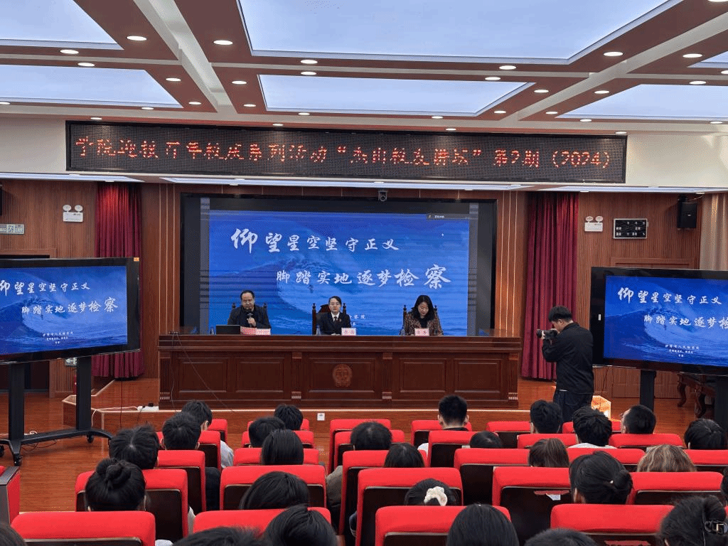 座谈会后,李茜在法学院模拟法庭作题为“仰望星空坚守正义 脚踏实地逐梦检察”的学术讲座。法学院副院长艾尔肯·沙木沙克主持,学院党委副书记、纪委书记李芳与谈,学院120余名本科生、研究生参加。在讲座开始时,李茜首先回顾自己在校期间的学习和成长过程,分享了自己逐步坚定理想信念,做到学以致用,成长为一名人民检察官,成长为“人民满意的公务员”的工作经历以及作为新疆政法干警代表和全国“人民满意的公务员”荣誉称号获得者,两次获得习近平总书记集体会见的感悟和荣耀,并深切感谢母校的栽培和老师们的辛勤教育。然后,她结合自己的检察业务实践,勉励同学们“无论将来做一名检察官、法官或者律师,都不仅是谋生的手段,而是中国特色社会主义法治建设的重要力量!因此要珍惜大学美好时光、树立远大理想目标,胸怀“主人翁”精神,用受过专业训练的双眼辨明真相,捍卫法之权威,执掌公平正义的利剑!”