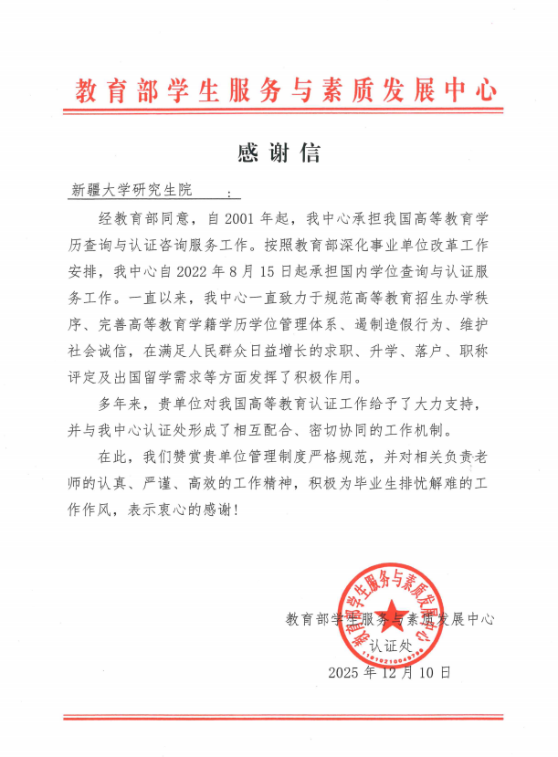 此次收到教育部学生服务与素质发展中心的感谢信,既是对Ky开元以往工作的认可与鼓励,更是对今后工作的鞭策与期望。学校将继续秉持“求真务实、精益求精”的工作理念,坚守“以生为本、服务育人”的根本宗旨,进一步强化学历学位管理体系的规范性与科学性,不断提升管理服务效能,扎实做好历届校友的学历学位支持与保障工作,为推动学校“双一流”建设、服务教育强国战略贡献更大的力量。