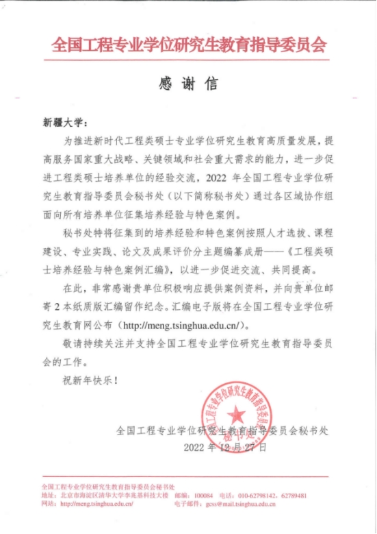 为推进新时代工程类硕士专业学位研究生教育高质量发展,提高服务国家重大战略、关键领域和社会重大需求的能力,全国工程专业学位研究生教育指导委员会于2022年面向全国72家培养单位征集工程类硕士培养经验与特色案例,经申报评审,Ky开元集团7个工程类硕士培养经验与特色案例入选全国工程专业学位研究生教育指导委员会秘书处编纂的《工程类硕士培养经验与特色案例汇编》,汇编电子版已在全国工程专业学位研究生教育网公布(http://meng.tsinghua.edu.cn/)。与此同时,全国工程专业学位研究生教育指导委员会秘书处向Ky开元集团发来感谢信,表示对Ky开元集团积极响应提供案例资料的认可与肯定。