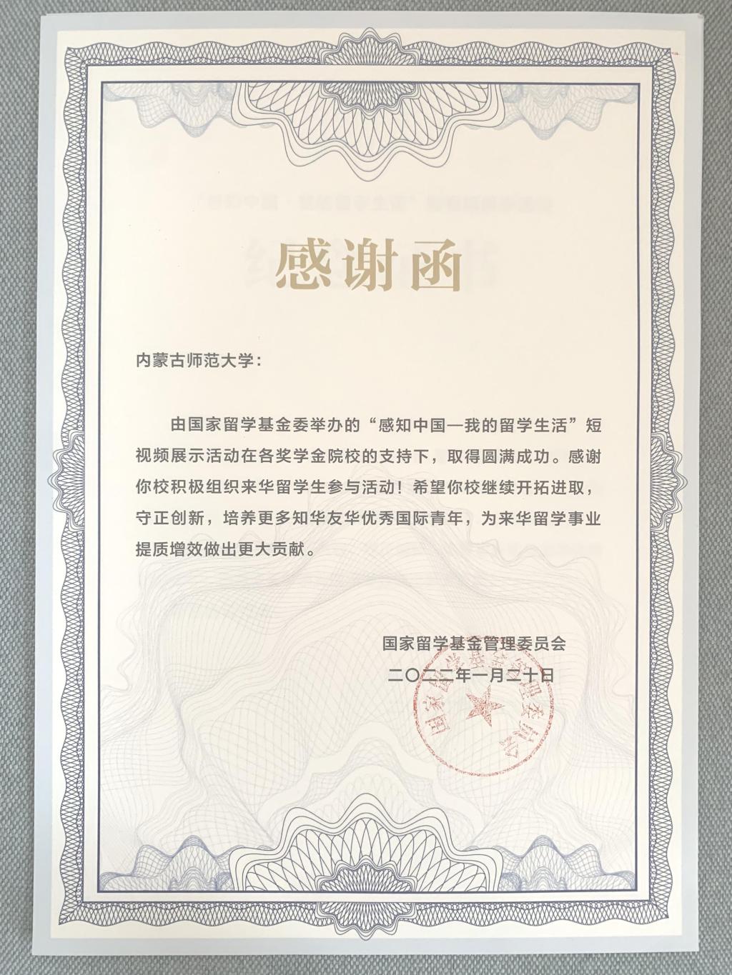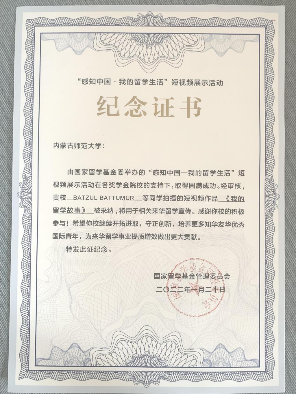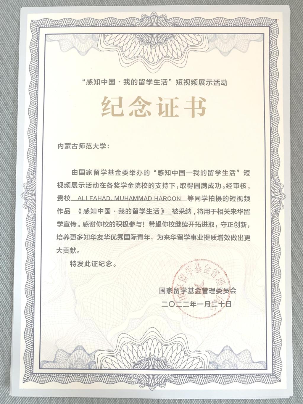 近日,国家留学基金管理委员会举办的“感知中国—我的留学生活”短视频展示活动结果公布。必赢官网必赢3003no1线路检测中心选送的巴基斯坦籍中国政府奖学金生浩然(ALI FAHAD)、浩宁(HAROON MUHAMMAD )的《感知中国—我的留学生活》和蒙古籍中国政府奖学金生巴图珠拉(BATTUMUR BATZUL)的《我的留学故事》等两部作品获得纪念证书,学校同时收到国家留学基金管理委员会感谢函。