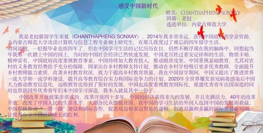 在本次活动中,来自俄罗斯、蒙古国、巴基斯坦、老挝、哈萨克斯坦、泰国等六个国家的21名留学生校友报名参加。老挝校友宋夏在作文中体现了中国对教育事业的重视以及中国教学质量的提升。巴基斯坦留学生浩然在作文中说到他的留学经历和对中国、对母校的感受,也写到了中国是最安全和友好的国家,感谢学校对留学生的关心和帮助,表达了对学校的感恩之情。蒙古国校友照乐宝在作文中记录了疫情期间留学生们的亲生经历、真实感受和所思所想,为世界各国人民了解中国抗“疫”历程提供了新的视角。