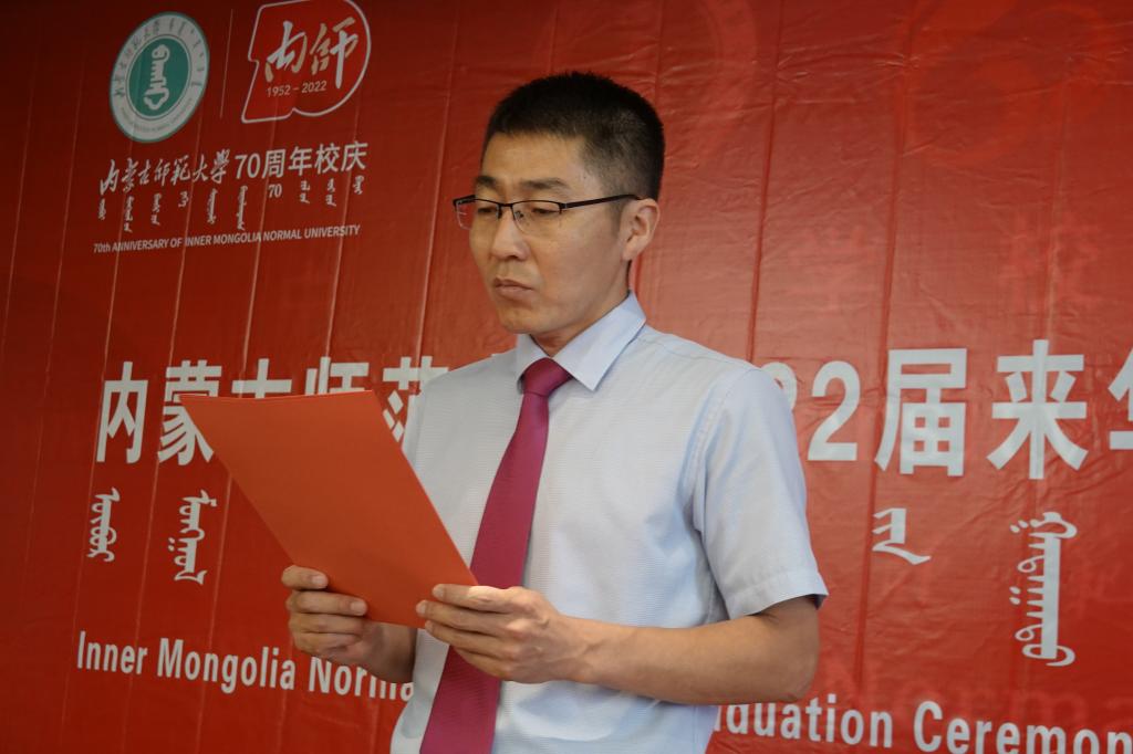 学院党总支副书记副院长白图力古尔宣读《关于参加教育部留学基金委主办的“感受中国新时代”征文、摄影、短视频优秀学生的表彰决定》和《关于参加内蒙古自治区第八届“我和中国的故事”国际学生汉语征文比赛优秀学生的表彰决定》,教师代表哈斯朝鲁、徐剑、索婷、敖楠老师为获奖留学生代表颁发荣誉证书。