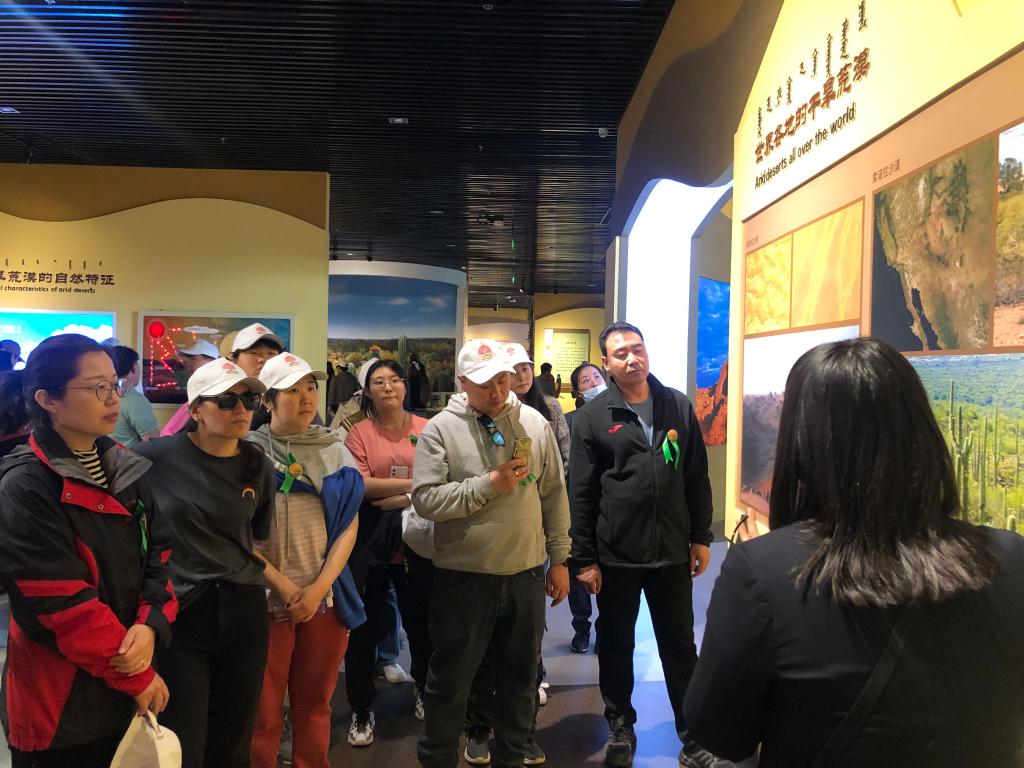 植树活动结束后参观了恩格贝沙漠博物馆和绿色农畜产品基地。恩格贝沙漠博物馆的讲解员从“一粒沙”讲起,介绍沙漠的种类、分布,普及了在荒漠地区如何合理开发利用天然资源进行荒漠化治理的科学知识,讲说恩格贝生态治理的成功案例。