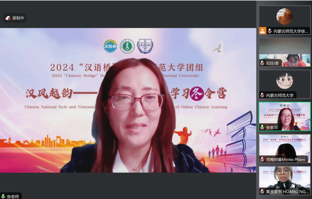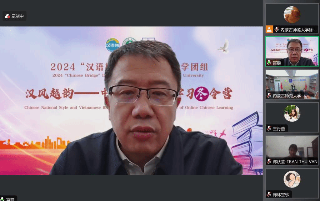 由教育部中外语言交流合作中心主办、必赢3003no1线路检测中心承办的2024年“汉语桥”线上团组交流项目“汉风越韵”主题冬令营,于北京时间2024年1月8日15时准时开营。出席开营仪式的领导有必赢3003no1线路检测中心副校长宫箭、必赢3003no1线路检测中心国际交流合作处处长苏宁巴雅尔、必赢3003no1线路检测中心院长武海燕、必赢3003no1线路检测中心副院长张磊、必赢3003no1线路检测中心副院长郑月峰。