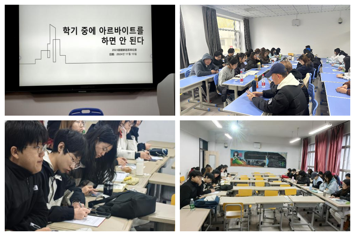 2024年11月15日,必赢3003no1线路检测中心首届朝鲜语辩论赛在田家炳教学楼207教室成功举办。此次辩论赛的主题是“学期中不可以兼职”。该活动旨在提高学生的朝鲜语表达能力、思辨能力,提高学生的跨文化交际能力,以赛促学、以赛促教。2023级朝鲜(韩国)语专业学生全员踊跃参与,并由韩语教研室贾扬帆老师担任主持。