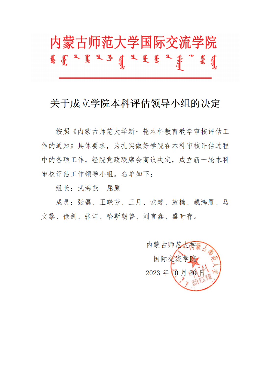 关于成立学院本科评估领导小组的决定