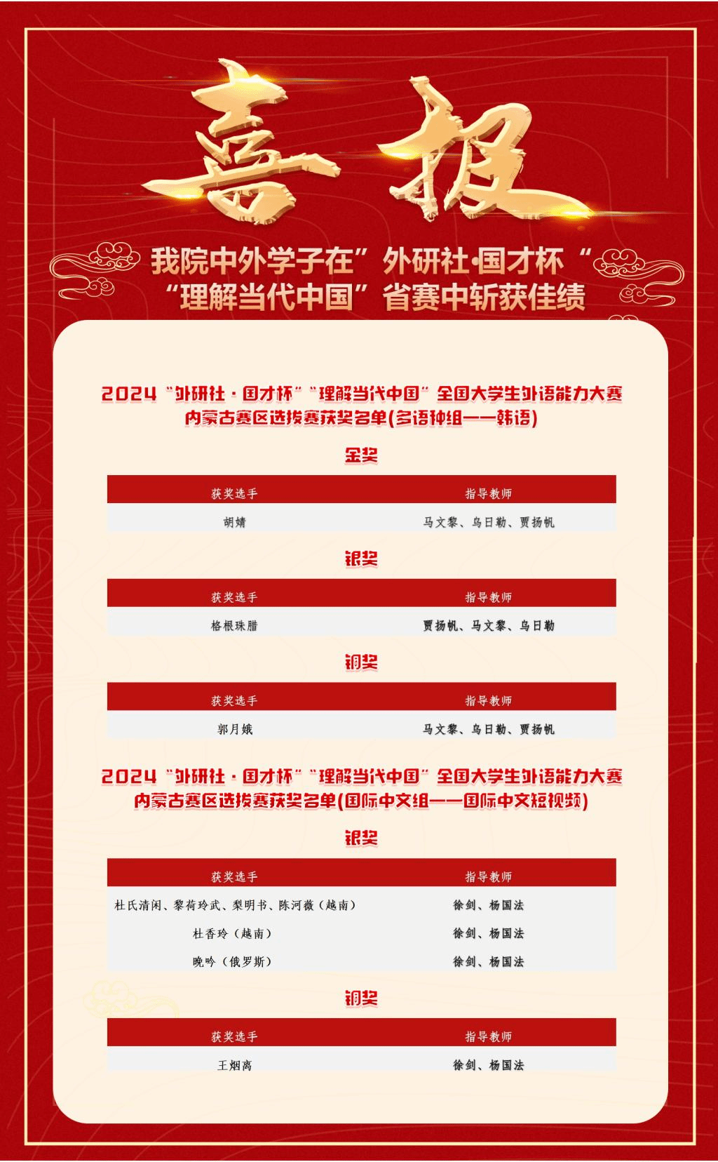 近日,“外研社 国才杯”“理解当代中国”全国大学生外语能力大赛内蒙古赛区选拔赛圆满落幕,必赢官网朝鲜语专业学生及来华留学生分别在多语种赛道、国际中文短视频赛道上大放异彩,共斩获一金、四银、两铜,其中朝鲜语专业胡婧同学进入了国赛,为必赢官网赢得了赞誉。