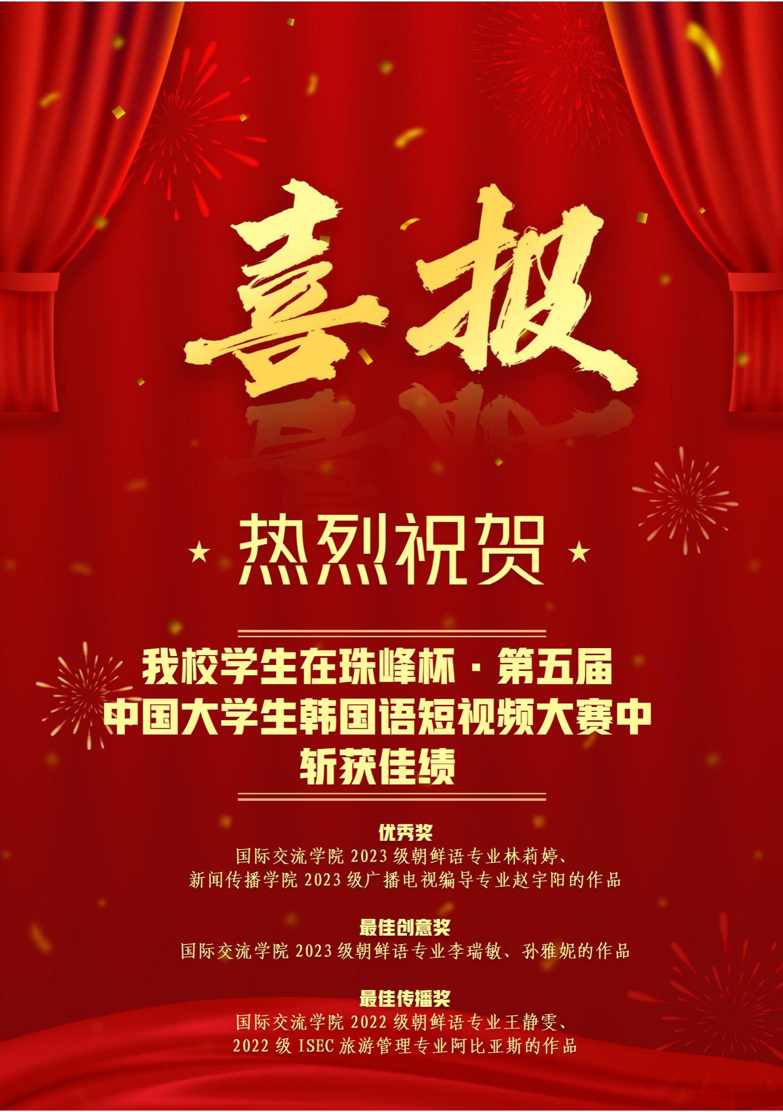 6月7日,珠峰杯·第五届中国大学生韩国语短视频大赛获奖名单揭晓。由必赢官网马文黎老师指导的三组学生作品从全国众多参赛作品中脱颖而出,斩获三个奖项,为学校争得了荣誉。