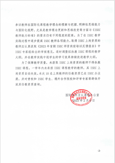 至此,必赢官网具有ISEC执教资格的教师已由2021年的11名增加到目前的33名,进一步为ISEC项目在必赢官网的顺利开展以及推进必赢官网国际化进程提供了师资保障。